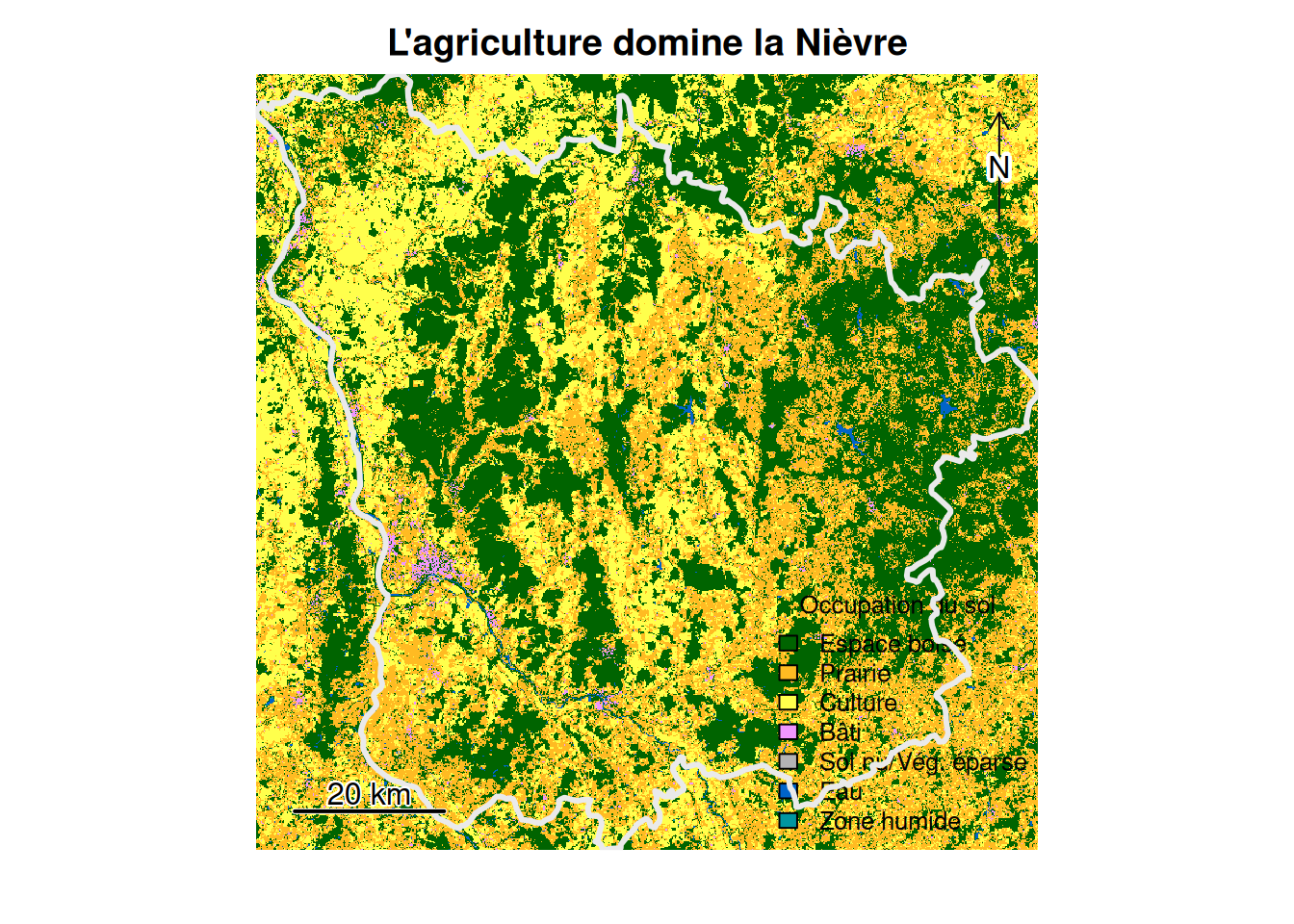 Par raster discret, nous entendons un raster dont les valeurs ne peuvent prendre qu’une certaine gamme. C’est le cas des rasters d’occupation du sol par exemple. Nous allons ici cartographier l’occupation du sol pour le département de la Nièvre.